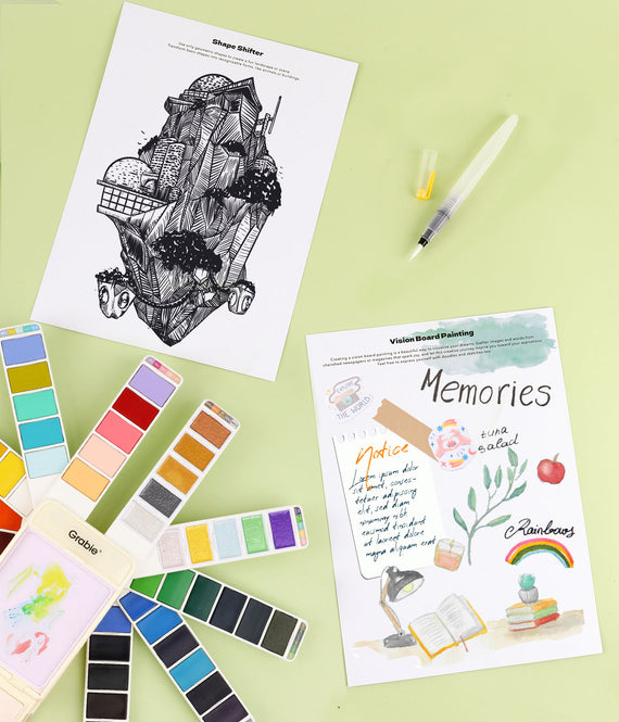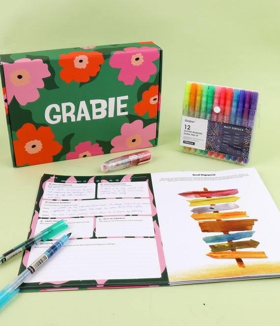 Our box is filled with exciting artistic tools to spark your creativity! Enjoy vibrant artist-quality watercolor paints in a wide range of colors, along with adorable gel pens for journaling and doodling. We’ve also included Grabie’s best-selling glitter acrylic pen for eye-catching highlights. Plus, a specially designed workbook offers fun activities to enhance your positive mindset.
